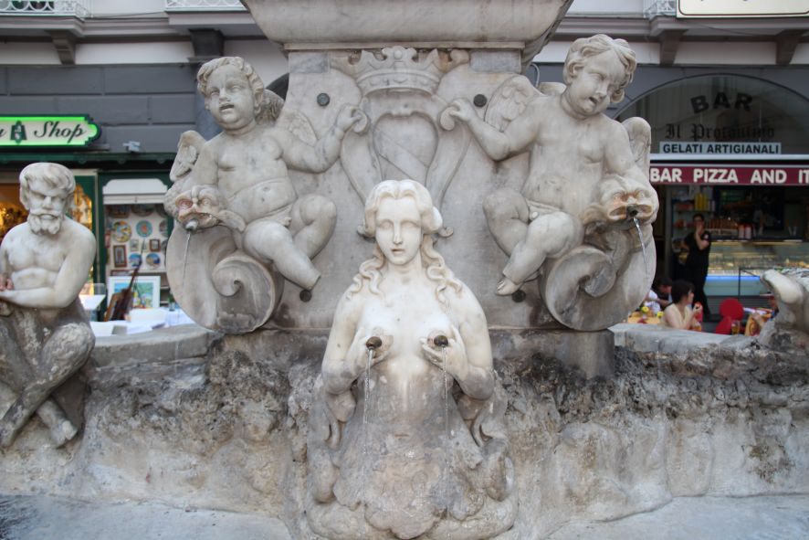 Und die Internetverbindungen sind schlecht, wir fliegen gleich wieder raus also hier ein kurzer Zwischenbericht mit nur 1 Bild. Wir eilen gerade nach Albanien um dort auszuklarieren, danach haben wir wieder 18 Monate Zeit für die gemächliche Weiterreise. Wir scouten aber die Gegenden schon vor. Momentan sind wir auf der Nordseite von Sizilien. Vorher waren wir auf den Liparischen Inseln, in Amalfi, auf den Pontinischen Inseln, in Südkorsika und Nordwestsardinien. „Im Schweinsgalopp“, meint Klaus. Hier ein Brunnen in Amalfi.