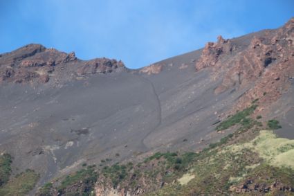 Der Mär des Menschen, der sich die Erde zum Untertan macht, wird auf dem Stromboli als grosse Illusion entlarvt! Der Abstieg ist ein Spaziergang auf sandigem Steilhang, man ist blitzschnell mit je einem Kilo Sand in den Schuhen wieder unten. Bildmitte sieht man den Weg, erkennt aber nicht, wie steil er ist.