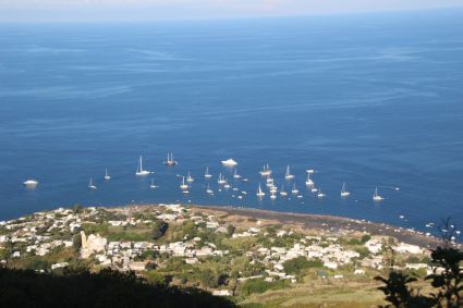 Hier der Blick auf den Ankerplatz vor Stromboli. Wir konnten uns einer Wandergruppe mit Bergführer anschliessen. Spätnachmittags marschierten wir los um kurz vor Sonnenuntergang oben auf dem Grat anzukommen. Alle 15 Minuten oder so gibt es kleine Eruptionen, die dank klarem Tag gut zu sehen waren.