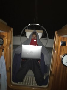 Wir gewöhnen uns an den Wachrhythmus, ab 20 Uhr alle 3 Stunden wechseln wir uns ab. Katrin nutzt die Zeit ihrer Wache sogar zum Arbeiten.