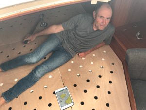 Sicherheitshalber schaffen wir alle Matratzen in die Vorderkabine und installieren die Notpinne. Das ist ein kurzer Hebelarm, der direkt auf die Achse des Ruderblattes wirkt. Diese Notpinne bedient man auf dem Bettrost liegend, ohne Sicht nach irgendwo. Man ist blind. Aber mit einer Seekarte auf dem iPad, die auch GPS-gekoppelt die Fahrtrichtung angibt, „sieht“ man ein bisschen: Instrumentennavigation. (Siehe nachgestelltes Foto). Während ich unten liege und steuere, wäre Katrin meine Augen und könnte mir durch das offene Achterluk zurufen, wenn ein Hindernis (Horror, ein anderes Boot mit Vorfahrtsrecht) käme. Es würde hart, aber wir sind zuversichtlich selbst das zu schaffen.