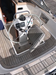 So geht das gut voran, wie am Schnürchen. Wir spulen 645 von am Ende 873 sm ab. Dann, am Morgen gegen 9.30 Uhr des vierten Tages auf See geschieht etwas Schwerwiegendes und ausgesprochen Dämliches. Wir sind beide auf, genießen nach der kalten Nacht die wärmende Sonne im Cockpit sitzend, als plötzlich in einer größeren Welle unser „Spießer“-Sitz, ein Klappsitz, der normalerweise das Sitzen an Bord sehr bequem macht, seinen Platz verlässt und zwischen Steuerrad und Lenksäule rutscht. Sofort wird das Steuerrad blockiert. (Siehe nachgestelltes Foto). Unser dritter Mann, der Autopilot arbeitet mit größter Kraft gegen an, was ihm natürlich nicht gelingt. Obwohl wir sofort reagieren, wir sitzen ja gleich daneben, stellen wir einen Schaden fest.