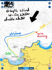 Zum Eingang in den Kanal kommt es dann hart. Unsere Steuerung gibt den Geist auf und wir beginnen zu treiben. Mit dem Starkwind Richtung Ufer. Zwei Meilen Abstand haben wir noch, also genug Zeit das vorbereitete Notprogramm abzufahren. Ich gehe runter zur Notpinne und „übe“ erst mal ein bisschen die Steuerung. Nach und nach klappt es und ich bin mir sicher, dass wir es bis in die ruhige Bucht abschaffen werden. Es ist allerdings sehr anstrengend, in voller Montur da unten zu liegen, kein Wind zu spüren, alles ruhig, auch die Wellen sind nicht wirklich auszumachen. Ganz anders bei Katrin, die oben im Cockpit ist. Sie ruft per VHF die SAR und diese machen sich auf den Weg uns abzufangen und ins Schlepptau zu nehmen. Sie gibt uns unsere Position durch, doch es dauert ewig bis sie uns finden, denn nach den 30 Minuten die sie von ihrem Stützpunkt bis zum uns brauchen hat sich unsere Position um 2-3 sm verschoben. Im Cockpit herrscht Ausnahmezustand, der Wind hat zugenommen auf über 30 kn aber die Wellen sind schlimmer, 4-5 m. Schlimmer deshalb, weil meine Steuerkünste nicht ausreichen die Saphir immer in die gleiche Richtung zu steuern. In Schlangenlinien geht es hin und her, mit der Welle, parallel zur Welle, gegen die Welle. Besonders übel ist es, wenn wir parallel zur Welle sind, dann schlägt das Wasser über die Bordwand. Das Achterluk ist offen, weil Katrin und ich sonst nicht kommunizieren können. Dadurch übernehmen wir Wasser in die Achterkabine. Gut, dass die Matratzen in Sicherheit sind.