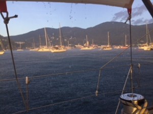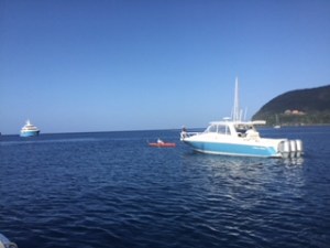 Am Morgen, bevor wir den Anker lichten noch ein Ereignis der dritten Art. Im Angesicht der Katastrophe rudert ein Kanu an uns vorbei, gefolgt von einem mittelgroßen Tenderboot mit 3×275 PS Motoren – zwei Mann an Bord zur Sicherheit für den Kanuten. Der Herr im Kanu (ein New Yorker Immobilientycoon) zieht seine Kreise durch die Bucht – sein Tender immer gut 20 m hinter ihm – und legt am Ende der Fitnessübung an seiner Yacht an.
