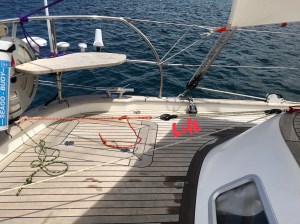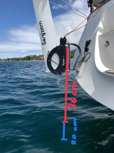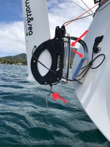 Im angehobenen Zustand schwenkt der W&S bei jeder Welle hin und her. Auf Dauer kann das nicht gut gehen. Wir haben deshalb eine Gummileine zur hinteren Klampe gezogen, die den W&S in einer Position festhält. Diese Maßnahme war die offizielle Empfehlung des deutschen Installateurs. Es funktioniert, aber es sieht echt beschissen aus.