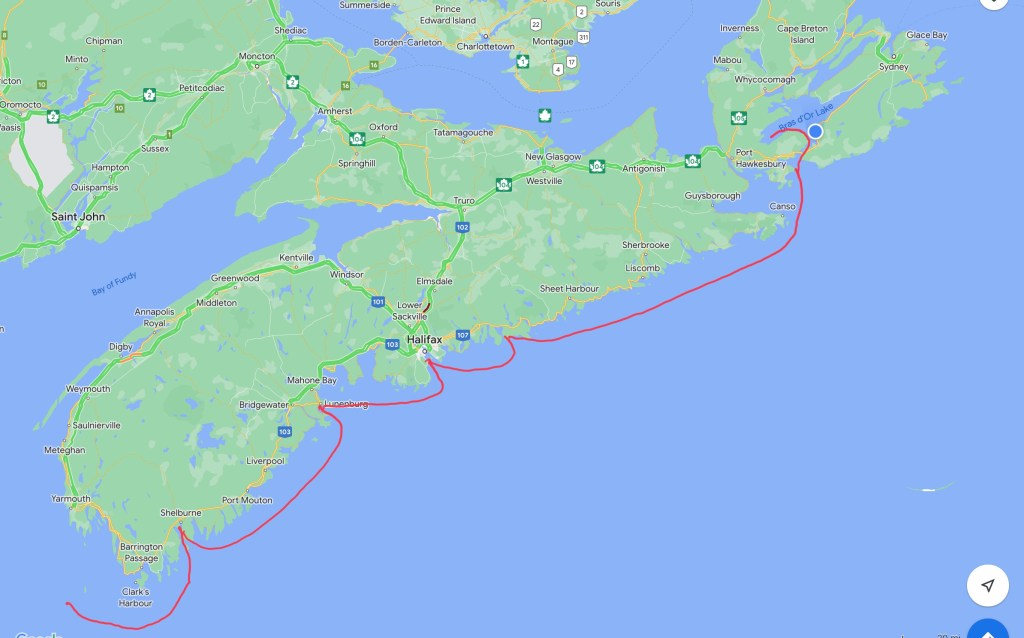 Wir sind nun fast die ganze Südost-Küste von Nova Scotia entlang gesegelt. Jede Etappe war anspruchsvoll. Von Shelburne nach Lunenburg hatten wir den Blue Water Runner gesetzt, ein Leichtwindsegel, das einen vor dem Wind besonders schnell macht. Das ist gelungen. Der Wind drehte aber auf 20 Knoten und wir hatten richtige Schwierigkeiten das Ding wieder zu bergen. Jedes Mal wenn wir es fast geschafft hatten blies sich das Segel wieder zu seiner imposanten Größe auf. Von Lunenburg (einer schwäbischen Pietistengründung) nach Halifax hatten wir Wind bis 30 kn aus Südost, also große Wellen und kleine Segel. Leider haben wir irgendwo einen Lobsterpod eingefangen und seine Leine schlang sich um unseren Hydrogenerator. Der Propeller verlor einen Flügel und die Halterung wurde total verbogen. Außerdem leckt jetzt Öl aus der Motorachse. Das Ding müssen wir zur Reparatur nach Frankreich schicken. Den gleichen Kampf gegen den Wind hatten wir auch auf den beiden Etappen von Halifax nach St. Peter‘s. Gut, dass hier der Wind aus Nordwest über Land kam und es fast keine Welle gab. Aber selbst im Reff II legte sich die Saphir noch weit über 20° auf die Seite, die See kam höher als zum Süllbord. Das Abendessen fiel aus. Aber nach der Ankunft nachts um 2 Uhr in der Ankerbucht genossen wir Rotwein mit Lasagne.